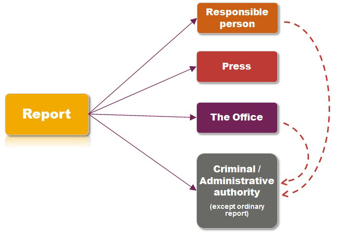 (ii) to the Office, however only in cases of a qualified report, in which case the Office will forward the report to the relevant criminal or administrative authority authorised to deal with it (in practice, it remains to be seen whether and how, or if at all, the Office will handle ordinary reports submitted to it);