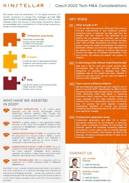 December 2020 – At Kinstellar Prague, we believe that the acceleration of the digital economy will force companies to change their strategies and fuel M&A opportunities in the technology sector. In 2020, we have already assisted clients with dozens of technology transactions. Based on our recent experience, we have put together a summary of some considerations for technology transactions, which can be found in the PDF below.