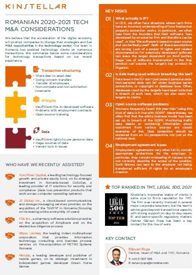 April 2021 – The acceleration of the digital economy will prompt companies to change their strategies and fuel M&A opportunities in the technology sector. Our team in Romania has assisted clients on a number of tech transactions and has summarised below some considerations for companies looking at this sector.